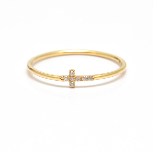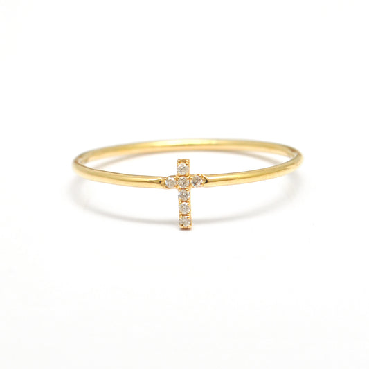 14k Solid Yellow Gold Pave Diamond Minimalist Cross Ring