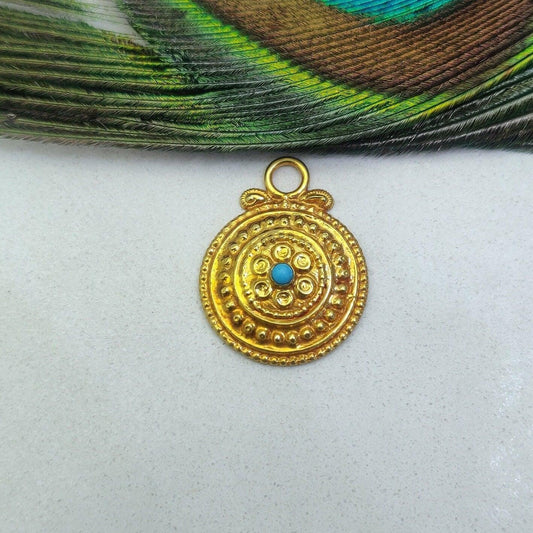 18k Solid Yellow Gold Turquoise Antique Round Pendant