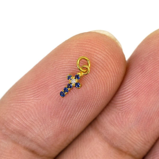 14k Solid Yellow Gold Pave Diamond & Blue Sapphire Cross Charm