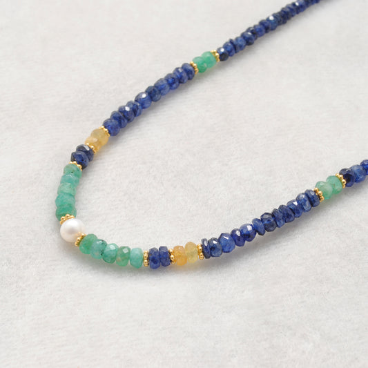 Emerald, Blue Sapphire & Pearl Beaded Necklace, 925 Silver, Handmade Gift
