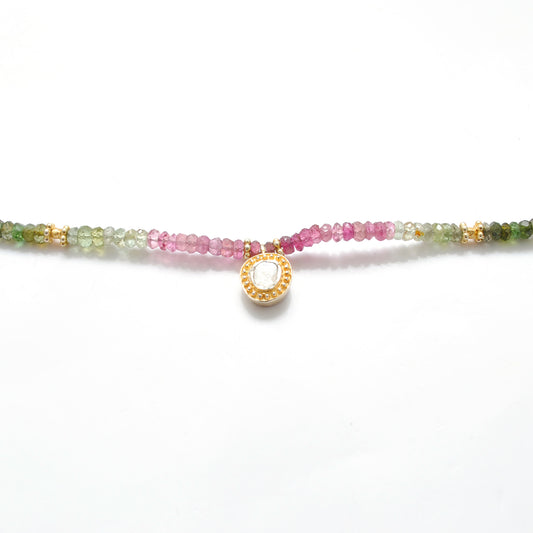 925 Sterling Silver Tourmaline Rondelle Beaded Necklace with Rose Cut Diamond Pendant, Handmade Gift