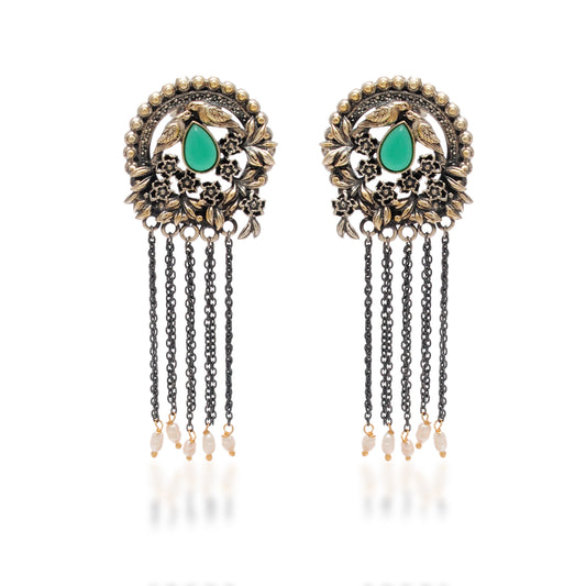 925 Sterling Silver Oxidized Bird & Floral Dangle Earrings – Green Stone Handmade Gift for Her