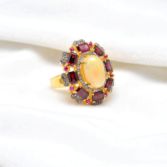 925 Silver Gold Plated Ethiopian Opal & Garnet Halo Victorian Ring 8 US