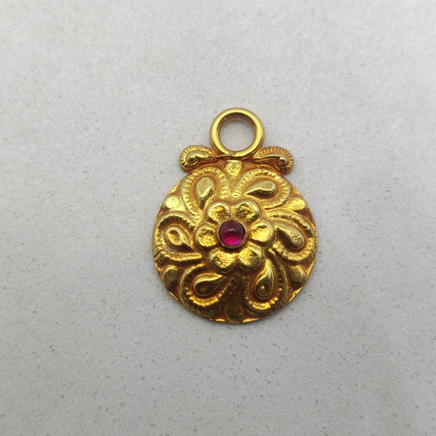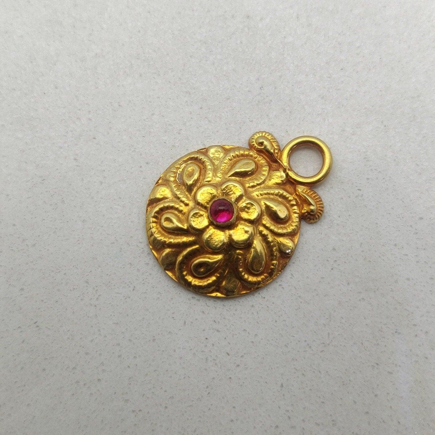 Expertly crafted with 18k yellow gold and adorned with a stunning ruby, this floral textured pendant exudes elegance and sophistication. Its luxurious design makes it the perfect accessory for any formal or special occasion. A timeless piece that will elevate any outfit and make you stand out with its beauty and charm.