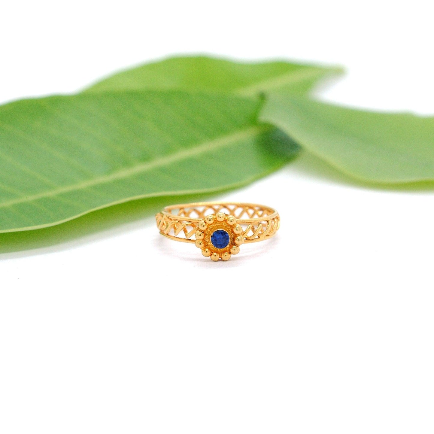 18k Yellow gold and a stunning blue stone, this handmade ring is the perfect addition to any jewelry collection.
