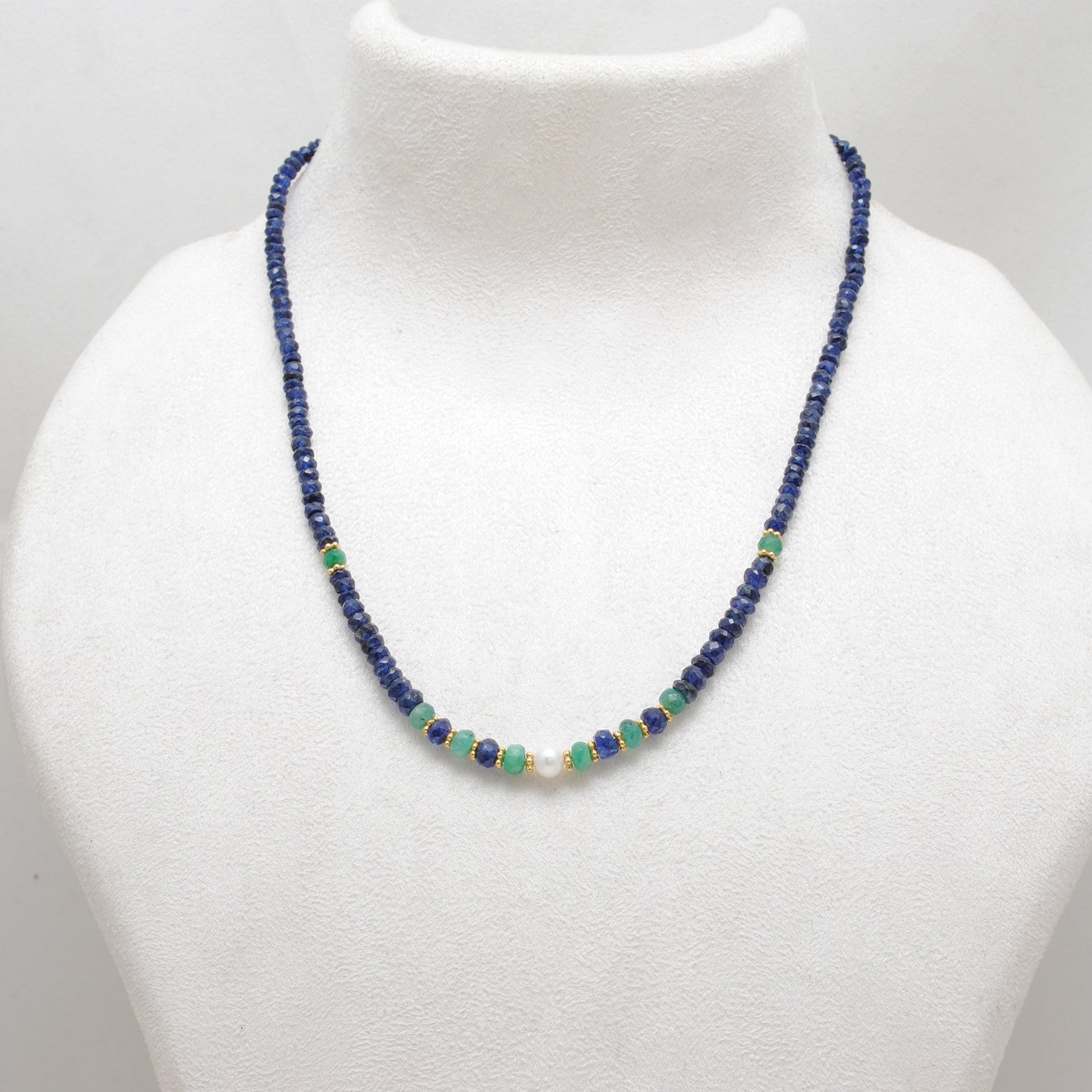 Emerald, Blue Sapphire & Pearl Beaded Necklace, 925 Silver, Handmade Gift