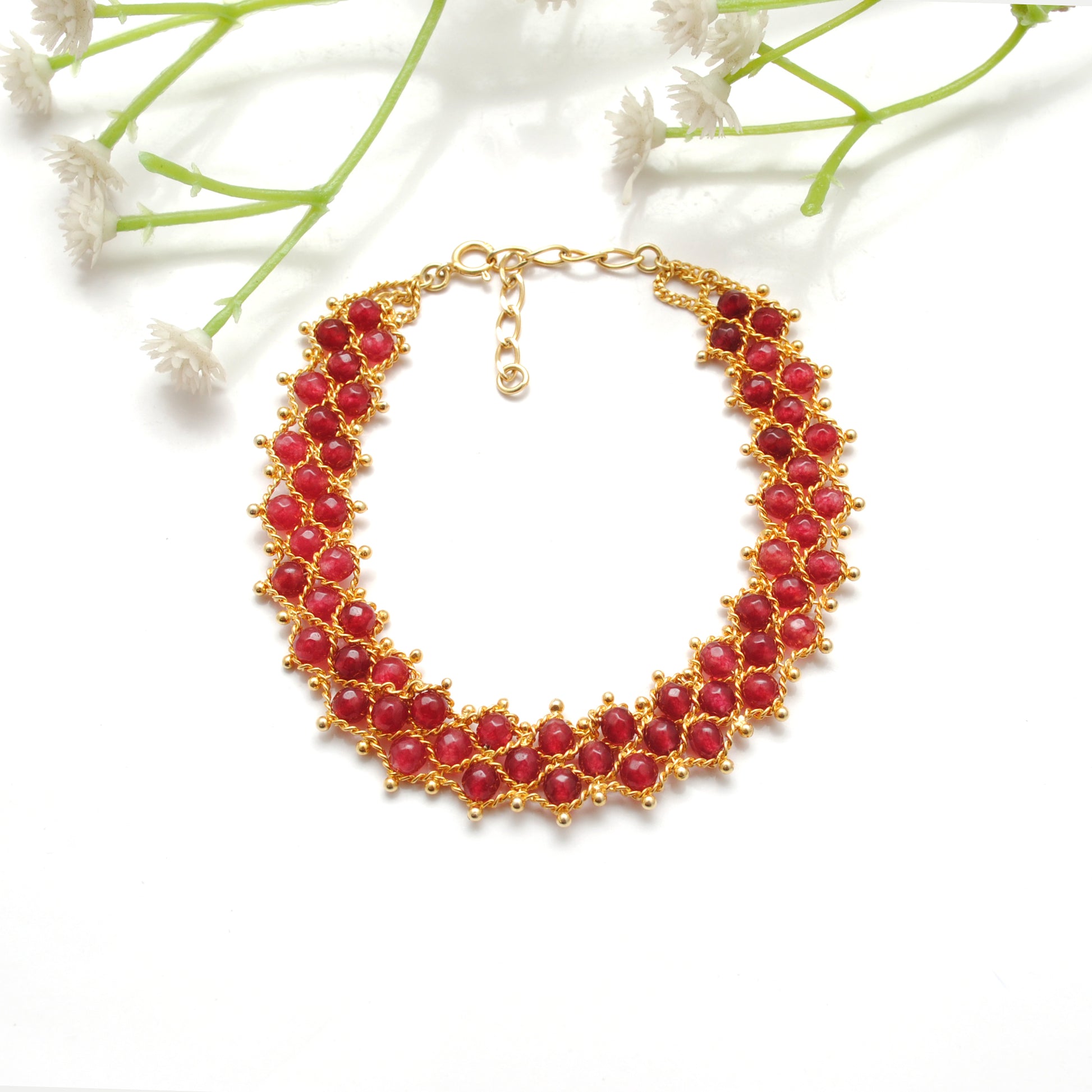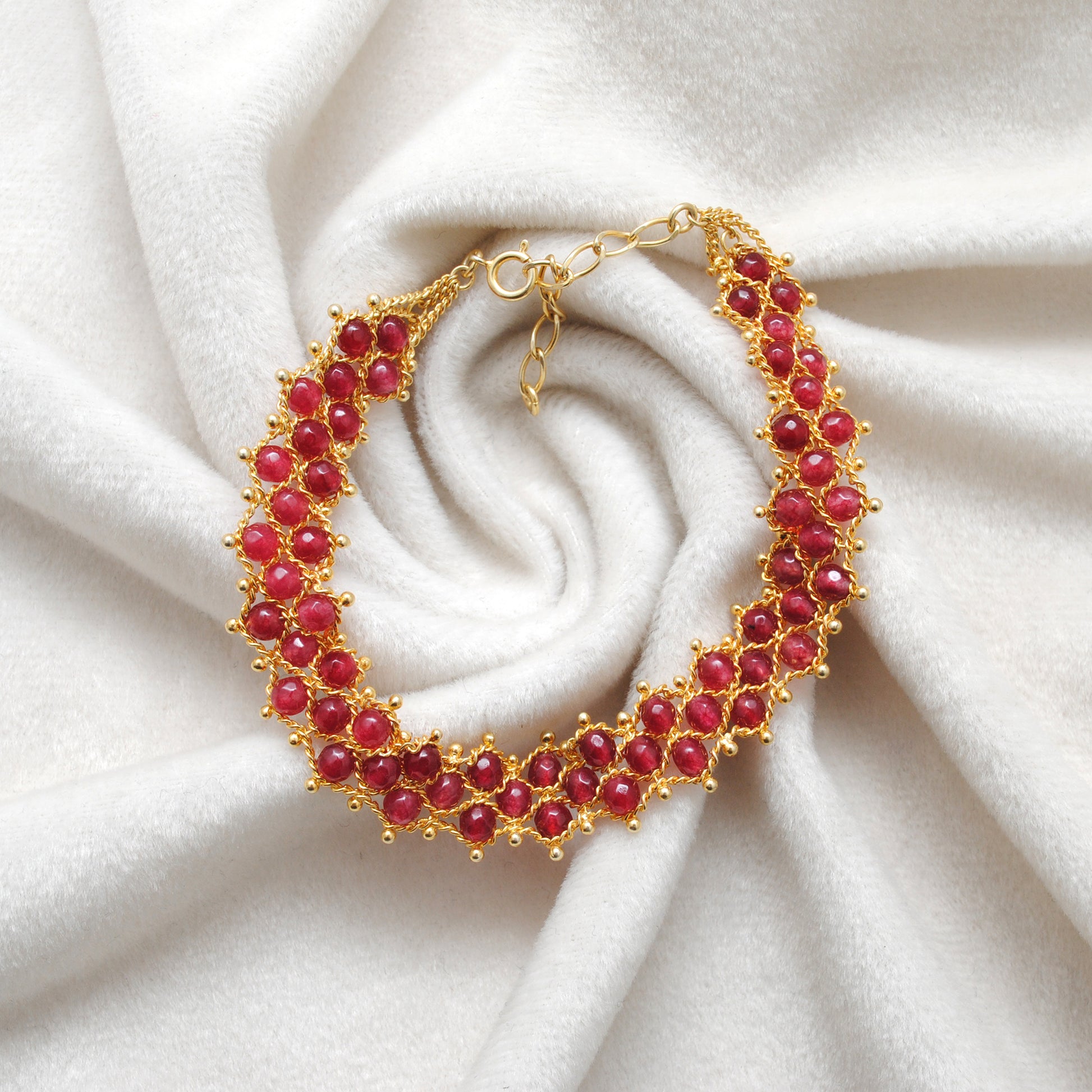 Elevate your jewelry collection with our stunning 18k Gold Ruby Beads Bracelet. This Victorian-inspired piece features intricate gold detailing and vibrant ruby beads, adding elegance to any look. Handcrafted with quality materials, enjoy timeless beauty with this one-of-a-kind bracelet.