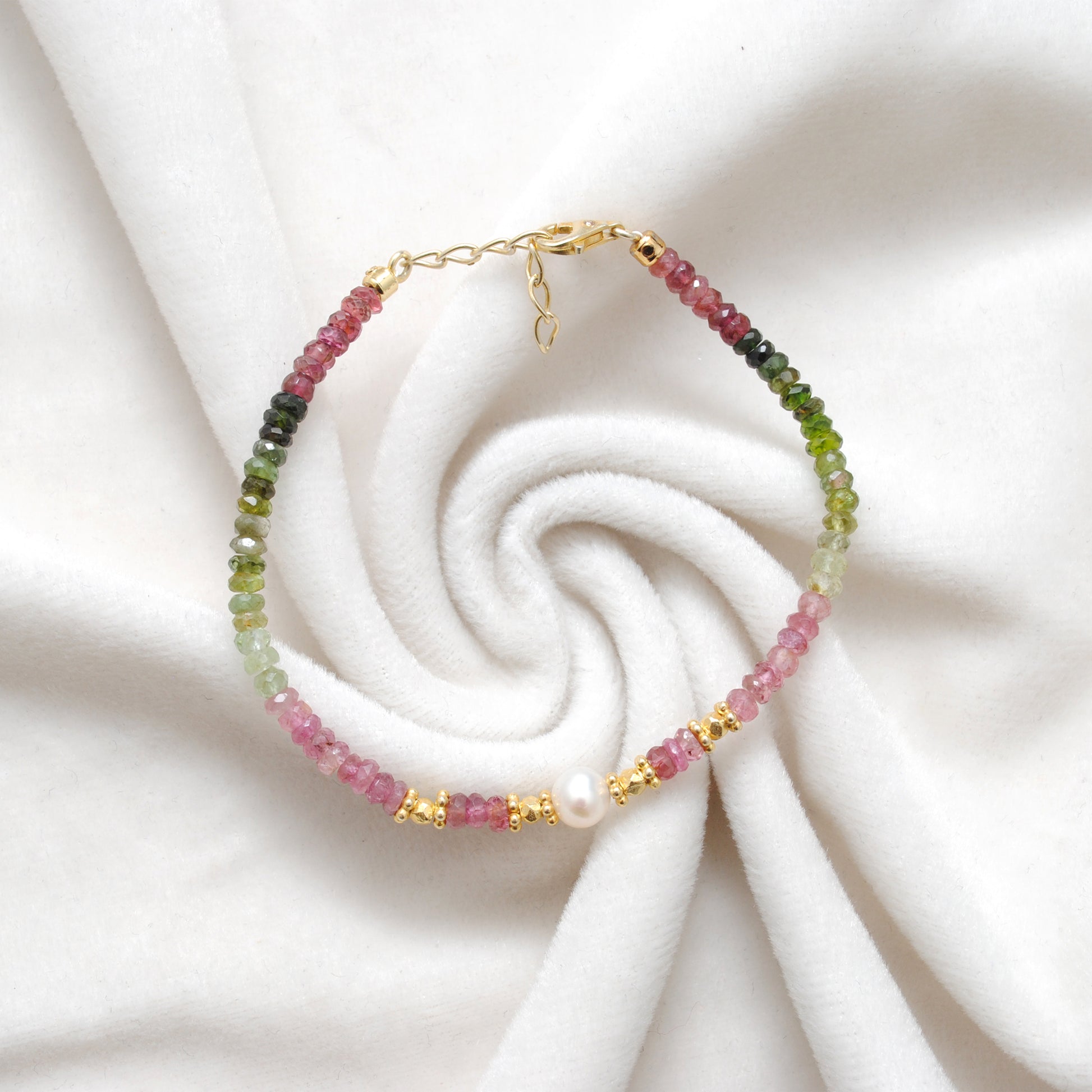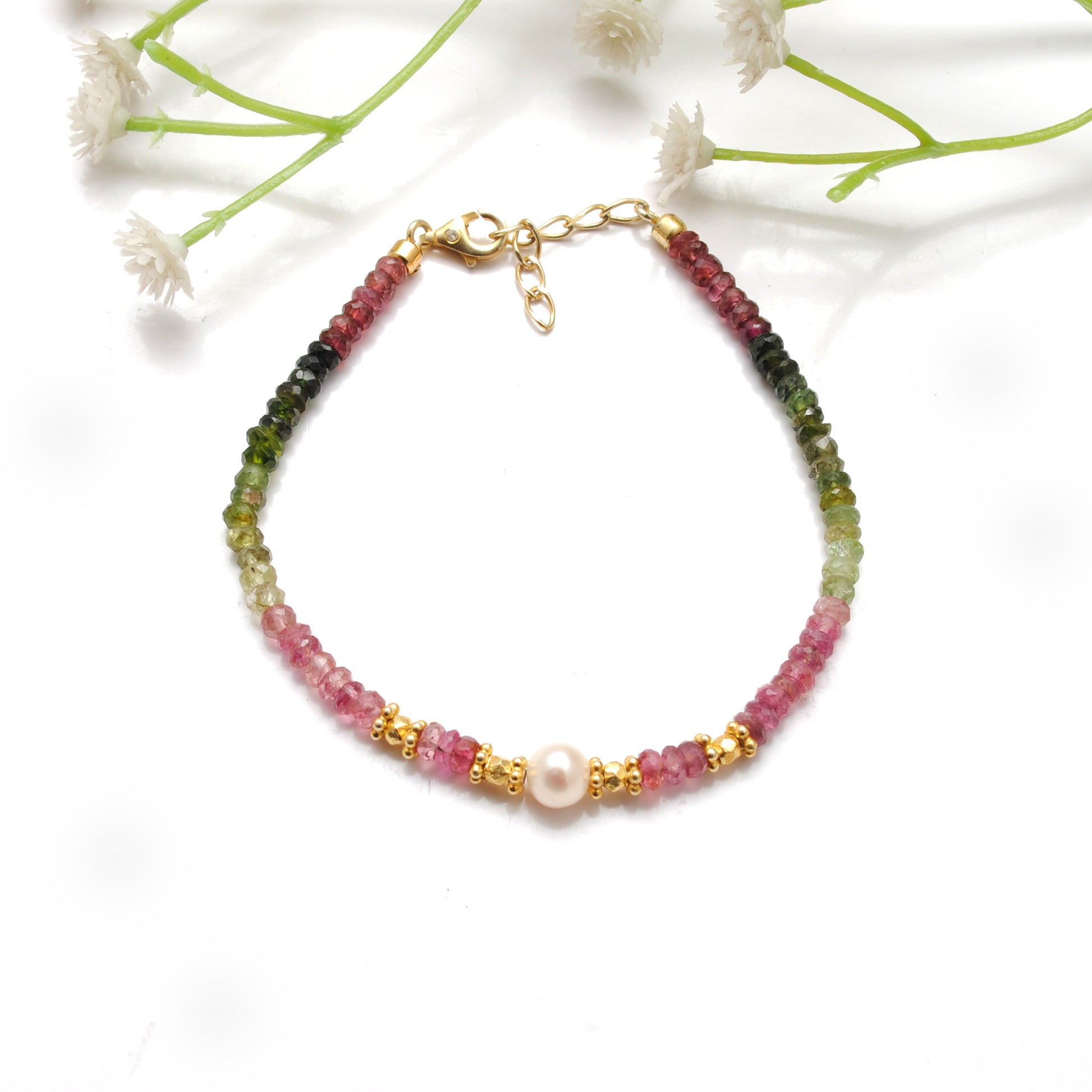 This bracelet features elegant tourmaline and sterling silver beads, with a luxurious 18k gold plating. The addition of pearls adds a touch of sophistication to this stunning bracelet. Perfect for any woman looking for a statement piece that exudes both style and class.