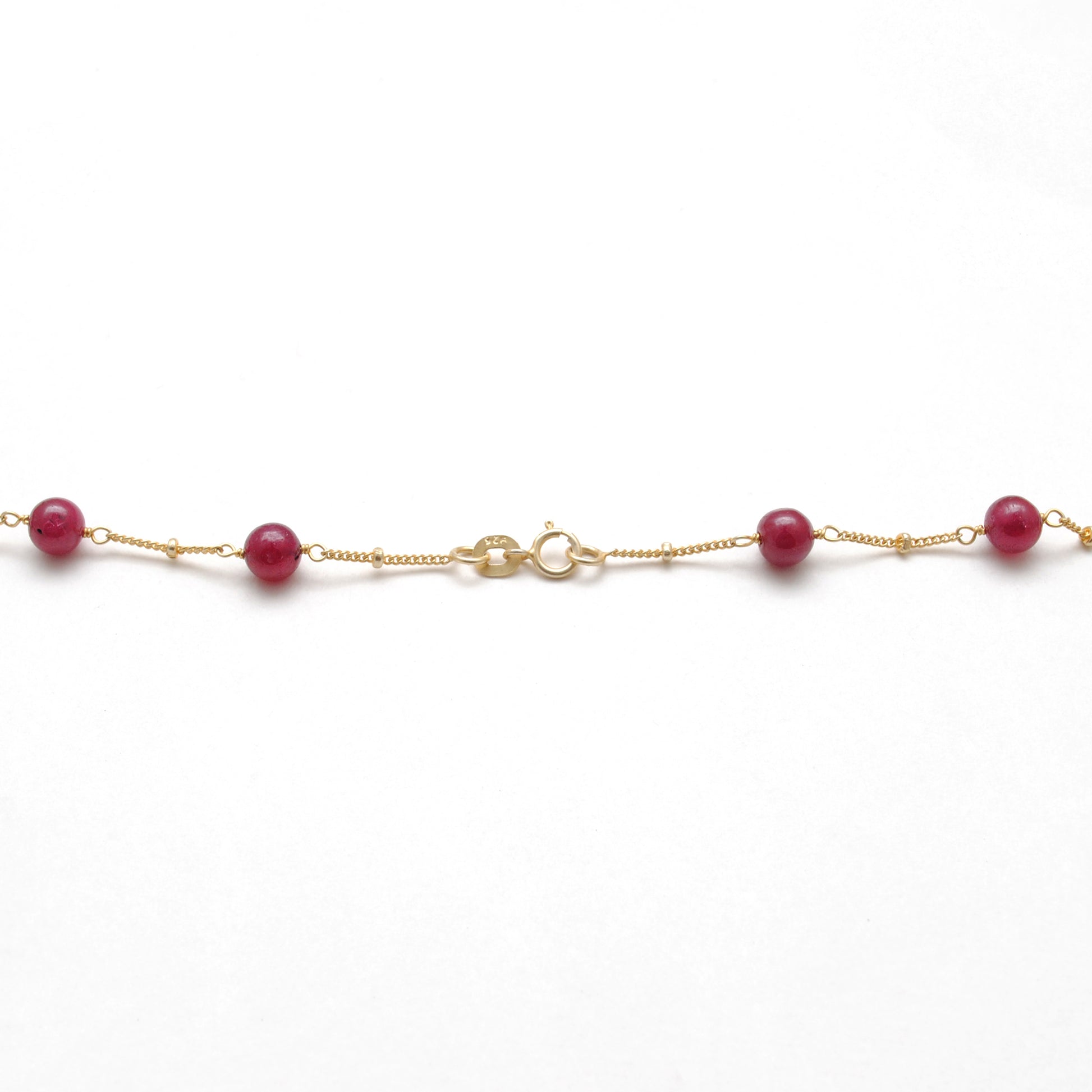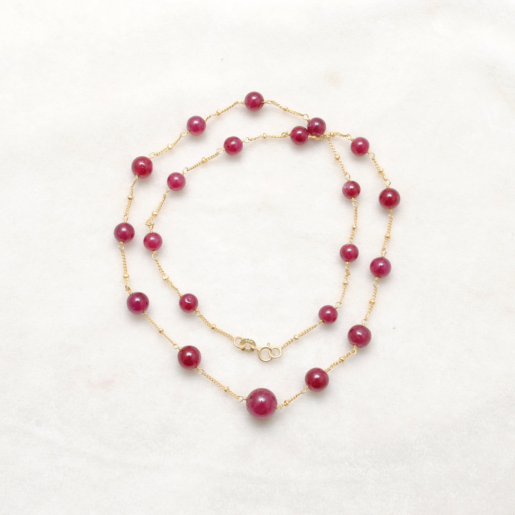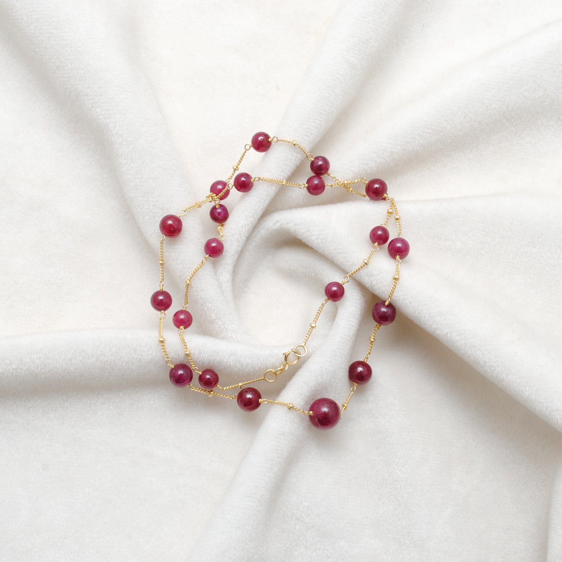 Crafted with natural ruby ball beads and plated with 18k gold, this necklace adds a touch of elegance to any outfit. The natural rubies give off a rich red hue, while the gold plating adds a luxurious shine. Perfect for formal occasions or dressing up everyday wear.