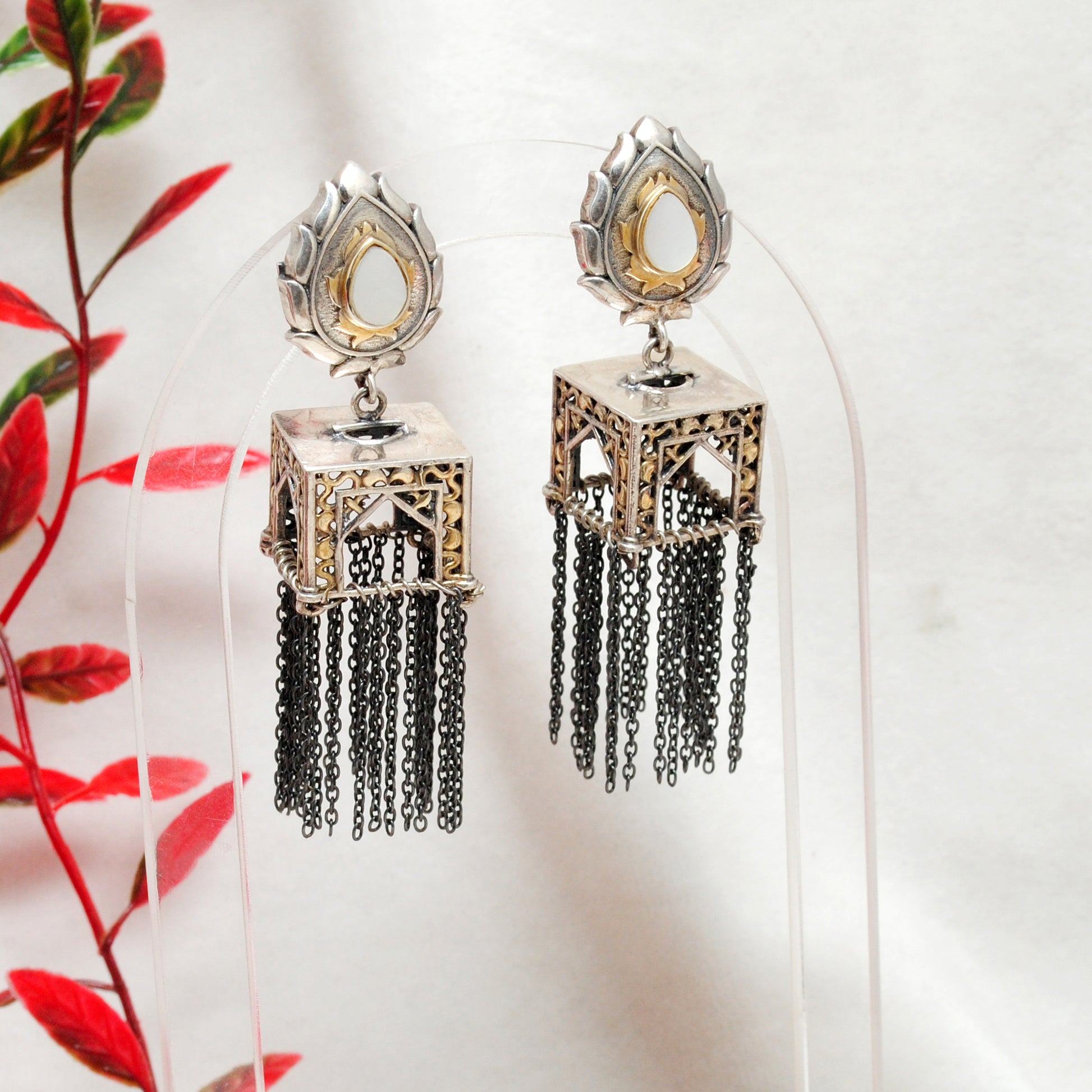 Embrace the grandeur of timeless architecture with these oxidized silver dangle earrings, inspired by traditional Indian temple and jharokha motifs. Featuring a lotus-style stud adorned with a teardrop-shaped green stone, these earrings flow into a beautifully crafted box-style dangler with cascading black chains, giving it a powerful, heritage-rich presence.