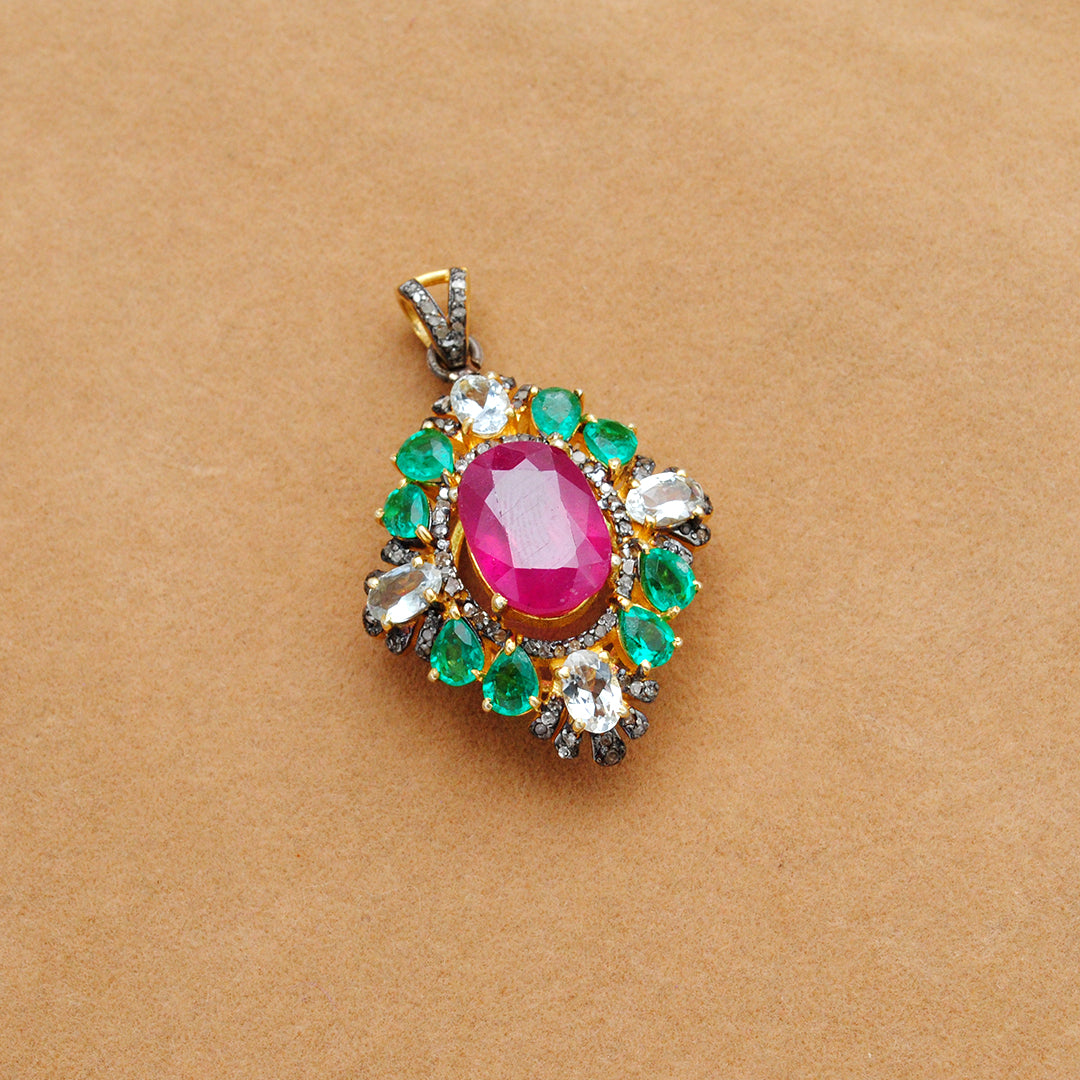 925 Silver Ruby, Emerald & Topaz Pendant with Pavé Diamond Accents | Gift for Her